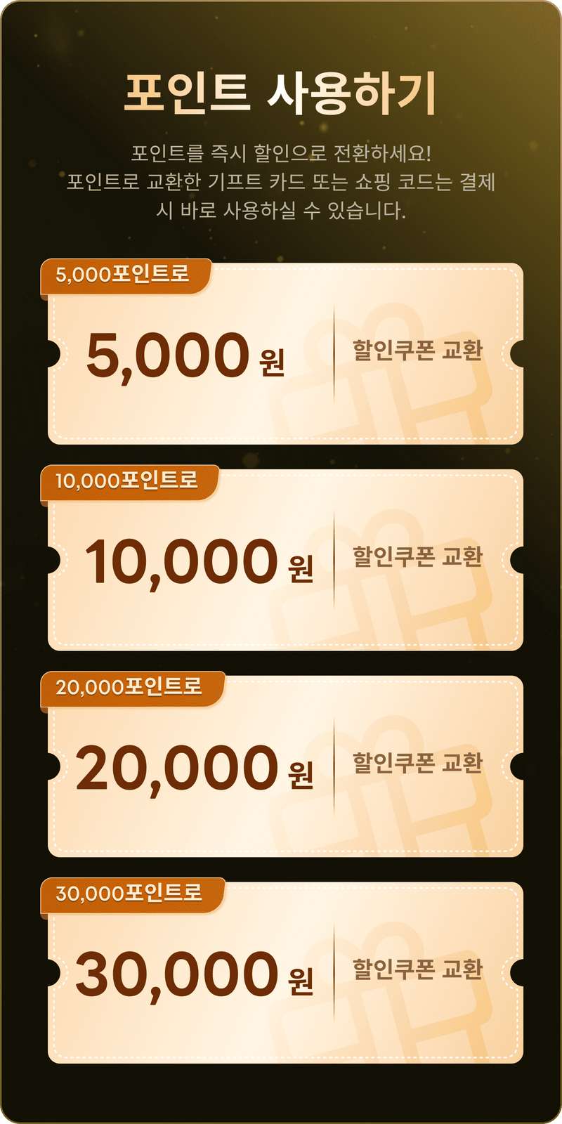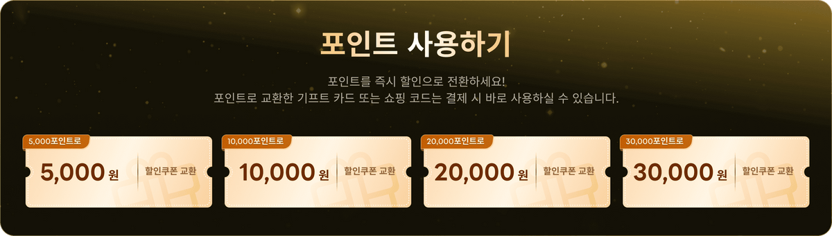 프로모션 기간 동안 보유하신 포인트로 할인 쿠폰을 교환하실 수 있습니다. (웹사이트 우측 하단의 '리워드'에서 교환 가능)