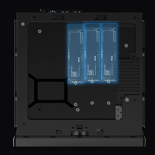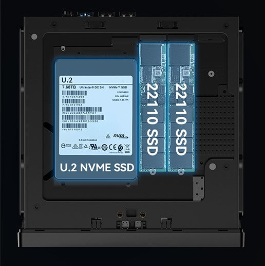 또한 하나의 U.2 NVME SSD와 두 개의 22110 M.2 NVME SSD로 구성된 엔터프라이즈급 스토리지를 지원하며, 총 24TB까지 확장이 가능합니다. 대용량 저장이 필요한 전문적인 요구 사항을 충족하세요.