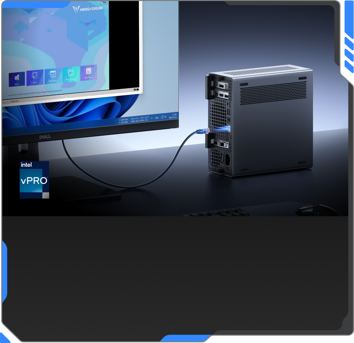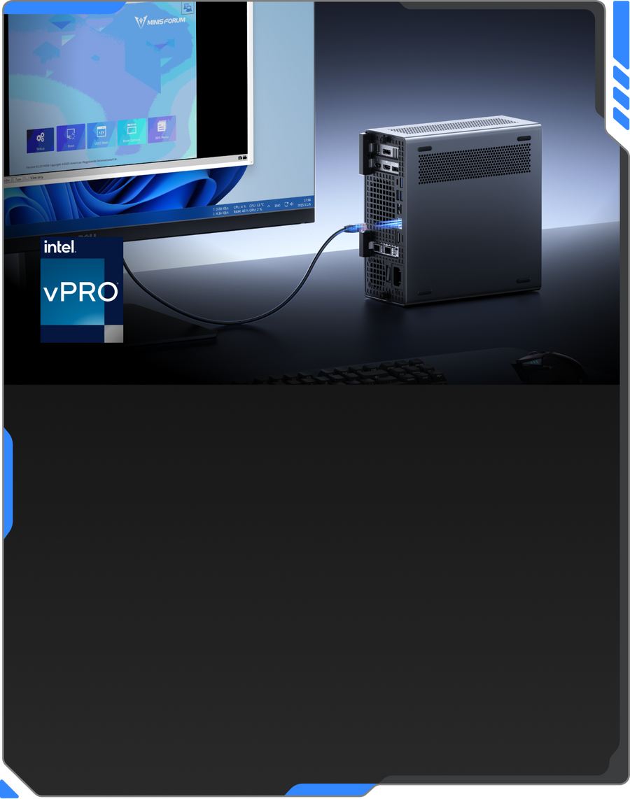 BIOS 수준 KVM을 지원하는 Intel® vPro®로 완전한 원격 제어와 24/7 가동 시간을 실현합니다.