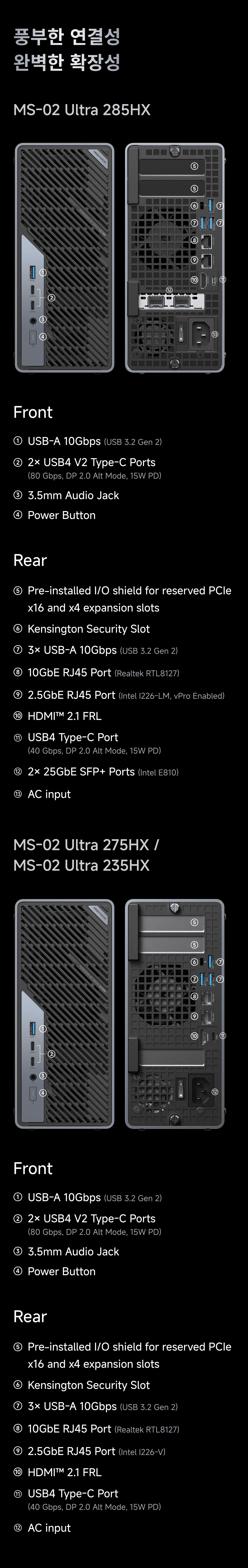 USB4 V2 Type-C 포트 2개(80Gbps, DP 2.0 Alt 모드, 15W PD)
