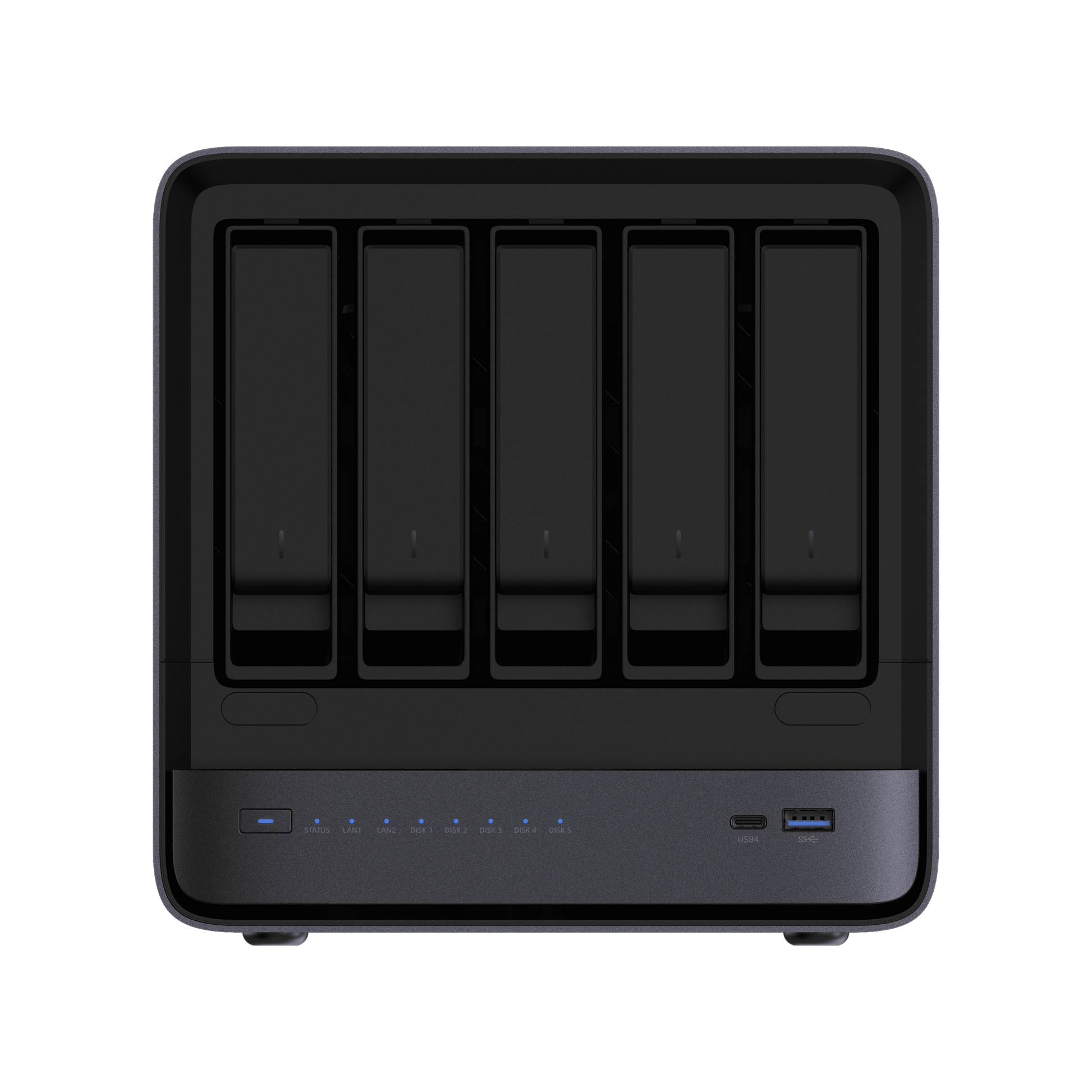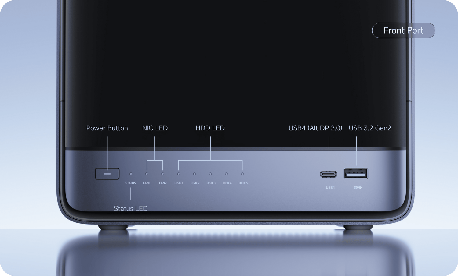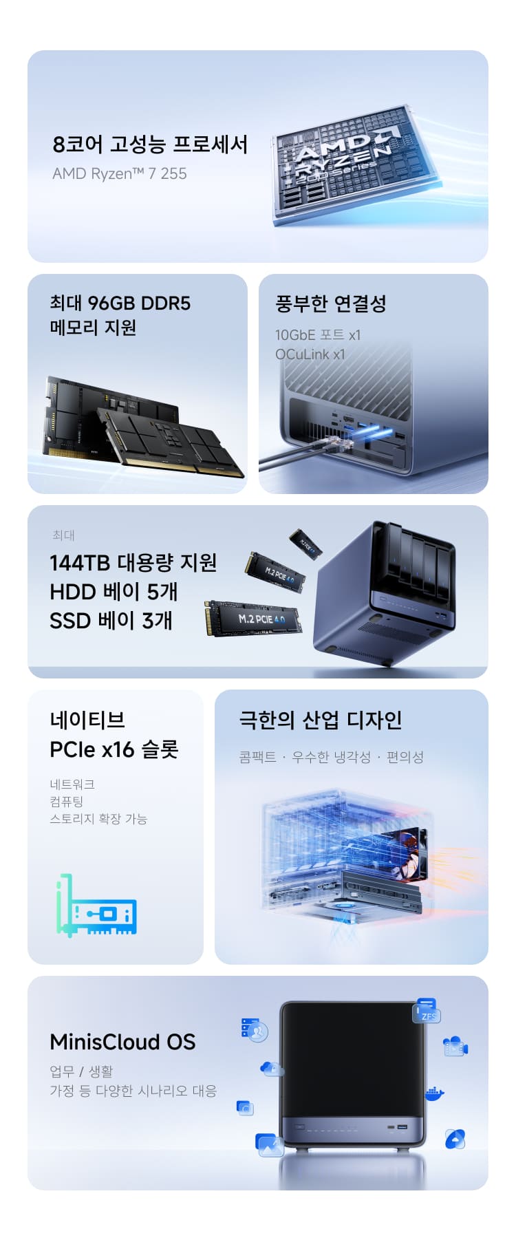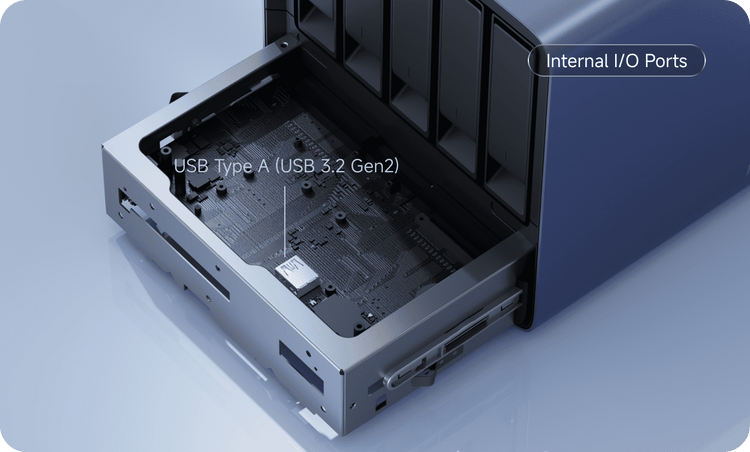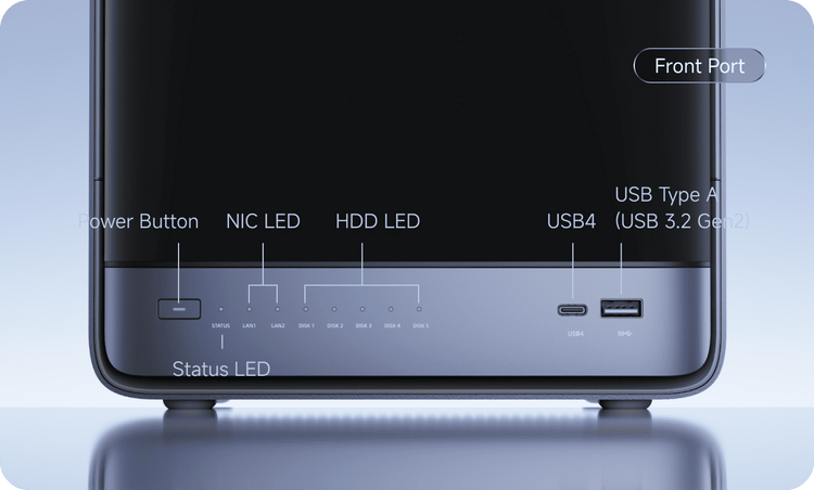 HDD 슬롯 (1–5): 3.5 / 2.5인치 HDD ×5 (최대 22TB / 슬롯, 총 최대 110TB, SATA 3.0)