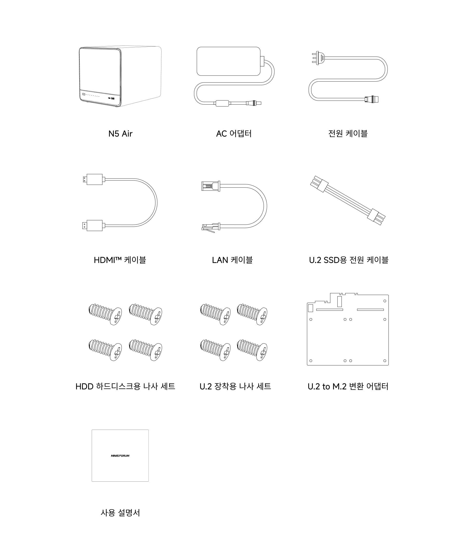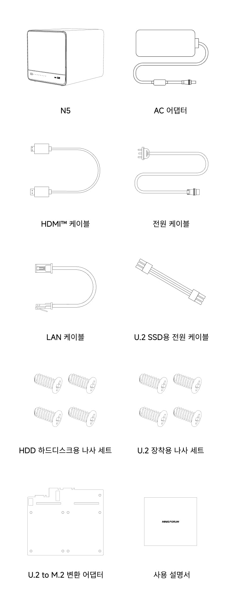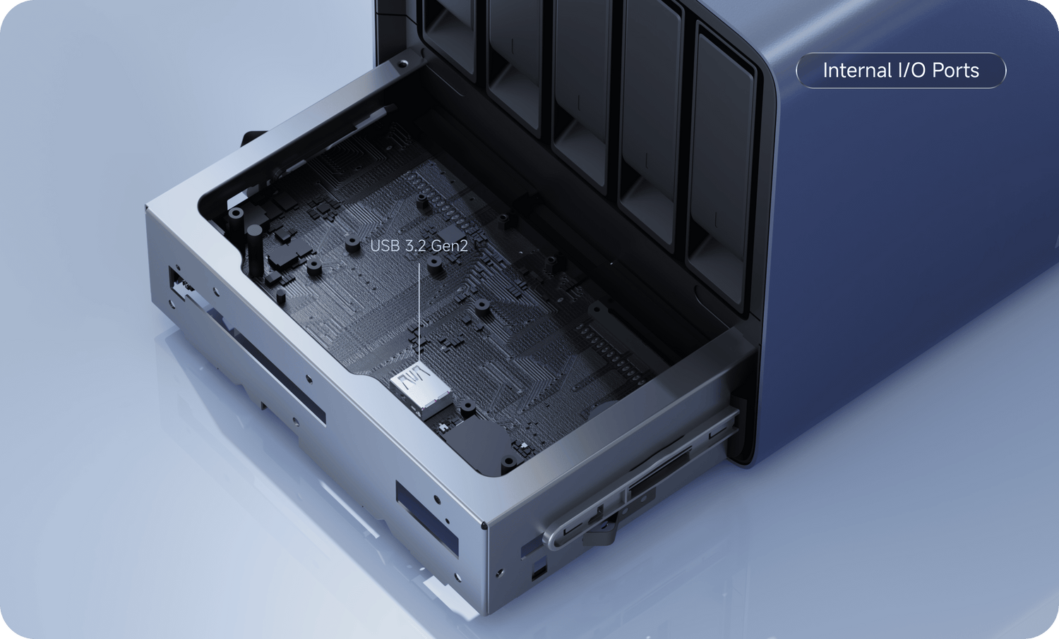 HDD 슬롯 (1–5): 3.5 / 2.5인치 HDD ×5 (최대 22TB / 슬롯, 총 최대 110TB, SATA 3.0)