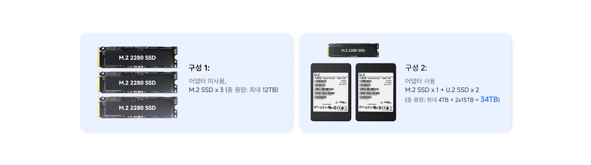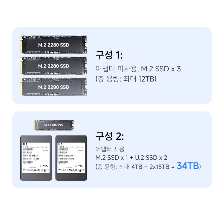 포함된 M.2 to U.2 어댑터 사용 시 → M.2 SSD 1개 + U.2 SSD 2개 (최대 34TB: 4TB + 15TB×2)