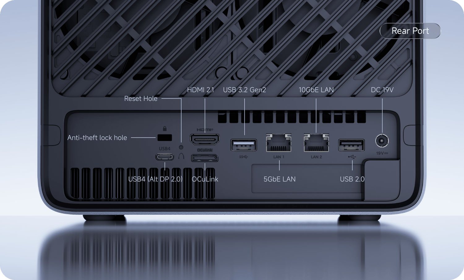 USB4(Alt DP 2.0)×1 USB 3.2 Gen2 ×1 USB4(Alt DP 2.0)×1 HDMI 2.1 FRL ×1OCuLink ×1 5GbE LAN(LAN1、RJ45、RTL8126)×1 10GbE LAN(LAN2、RJ45、RTL8127)×1 USB 3.2 Gen2 ×1USB 2.0 ×1 PCIe ×16 (PCIe 4.0 ×4)×1 USB 3.2 Gen2 ×1