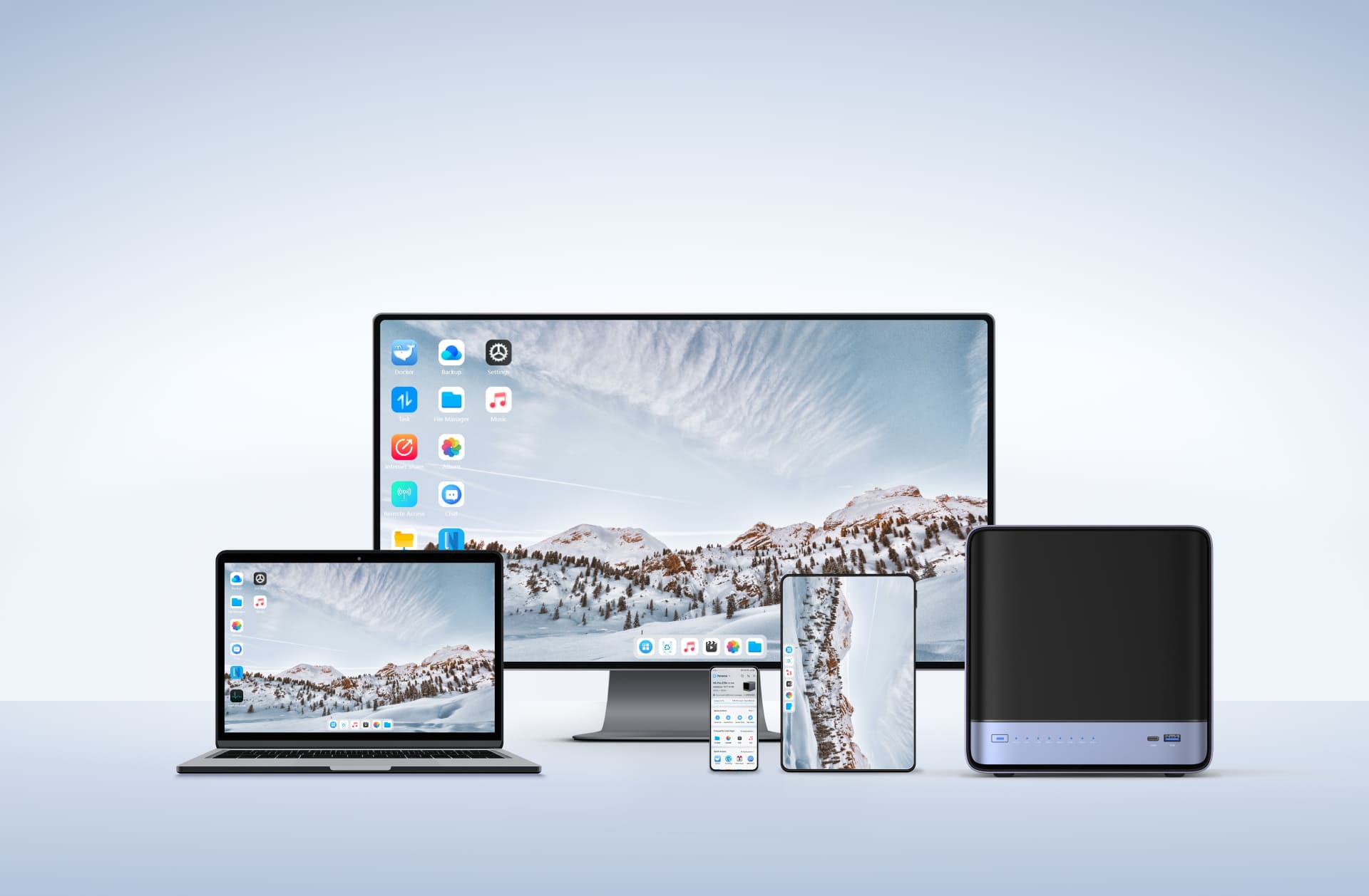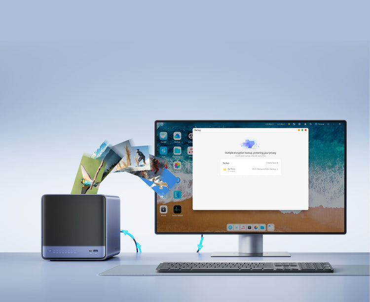 Windows/macOS/iOS/Android 무학습 곡선 지원. ZFS 스냅샷, LZ4 압축, 다중 사용자 격리, Docker, AI 앨범, 원클릭 원격 접속 통합.