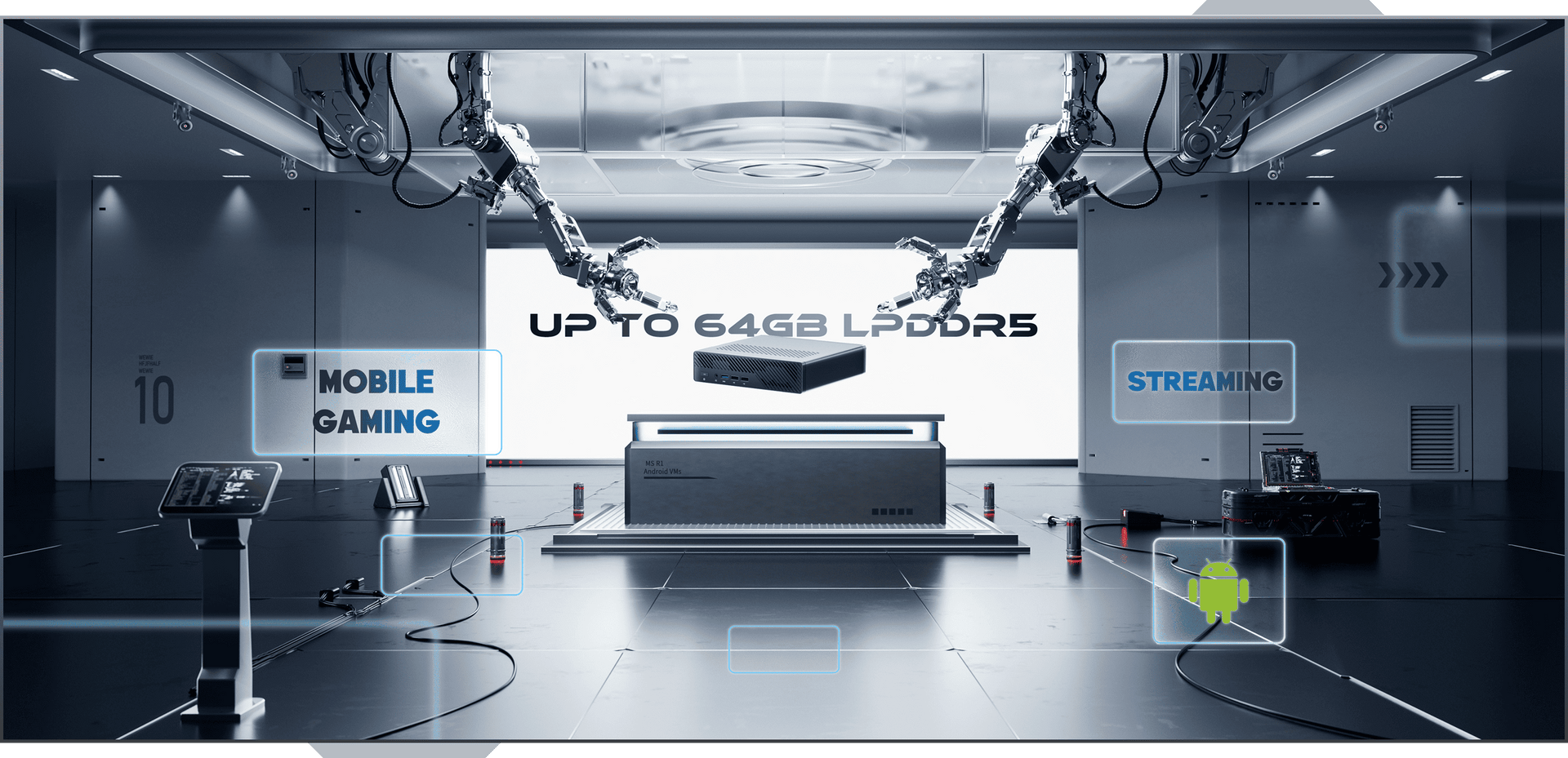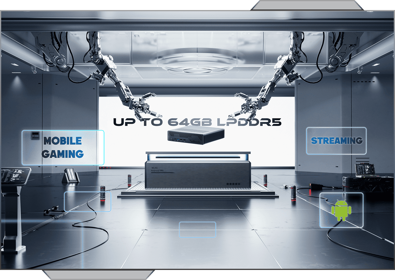 컨테이너 및 Docker 기반 Android VM에 최적화되었습니다. ECC를 지원하는 최대 64GB LPDDR5 메모리로 최대 15개의 Android 인스턴스, 15개의 TikTok 스트리밍, 또는 60fps로 3개의 원신 세션을 동시에 실행할 수 있습니다. 테스트 또는 멀티 게이밍에 완벽합니다.